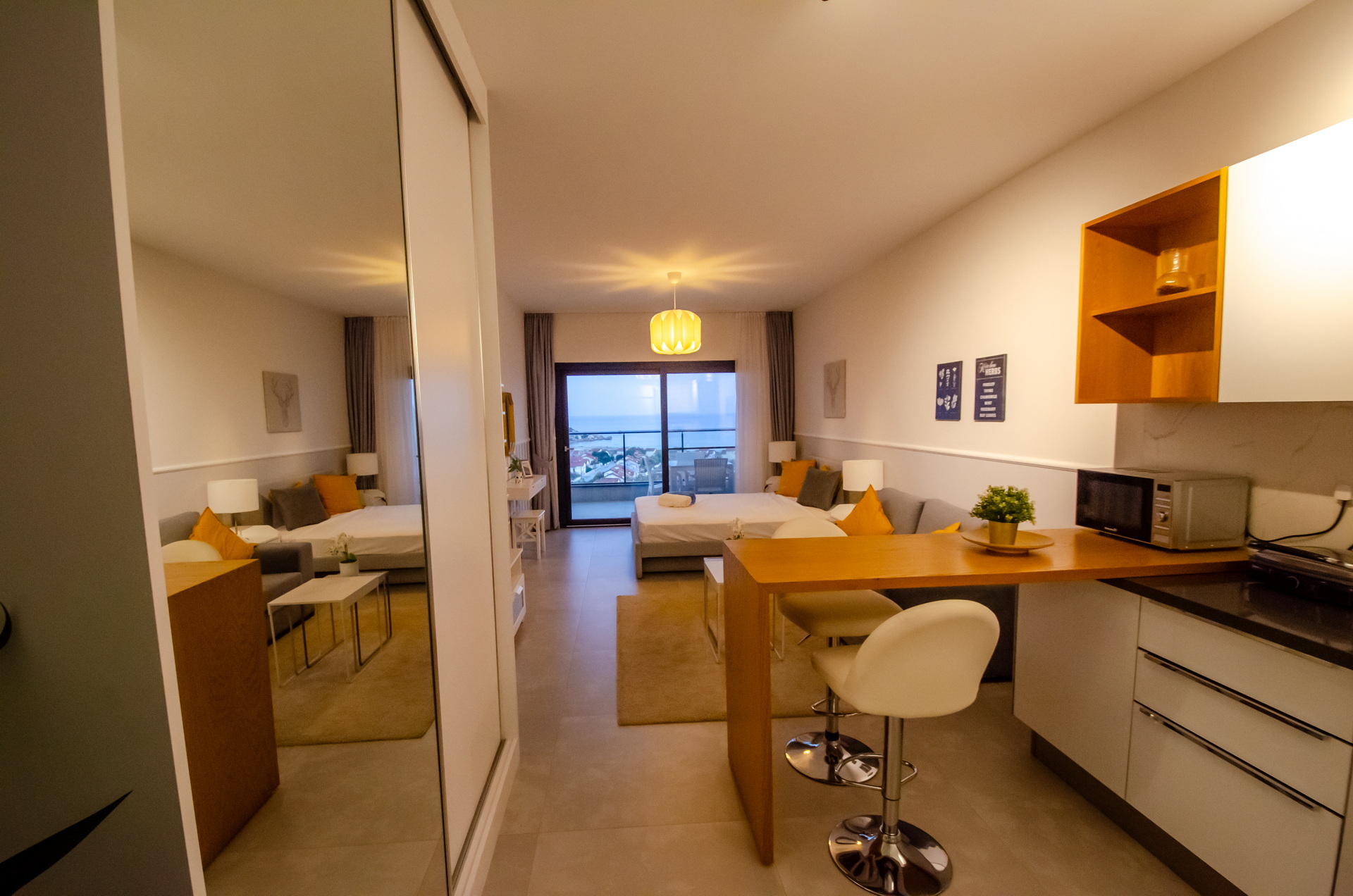 Comfortable and spacious studios, tailored to your needs, offer a fully equipped kitchen, free Wi-Fi, a functionally furnished living area, and picturesque views from the balcony.